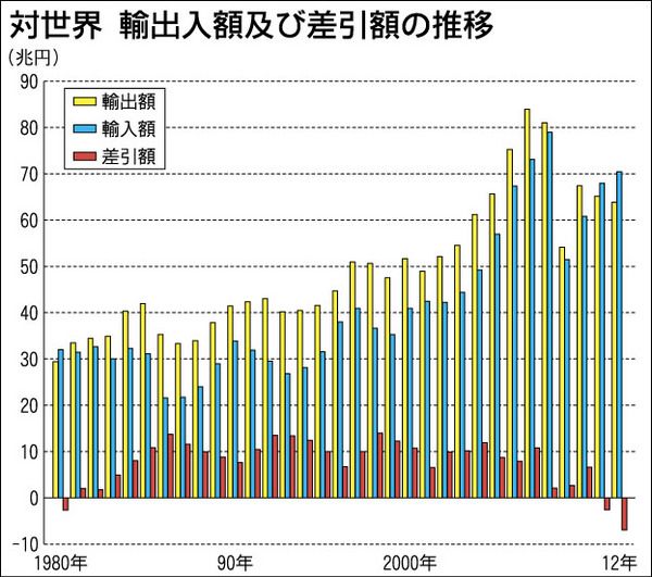 2012年の貿易赤字が過去最大の6兆9273億円を記録した。東日本大震災後に相次いだ原発停止で火力発電用の燃料輸入が大幅に増える一方、欧州債務危機など世界経済の減速や日中関係悪化、円高の影響で輸出は減少。「ダブルパンチ」で赤字額が11年の...