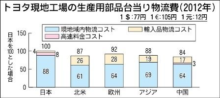 トヨタ自動車は、主要国のトヨタ現地工場における生産用部品の物流コスト構造を明らかにし、政府に高速通行料の引き下げをあらためて求めた。日本の台あたり物流費を100とした場合、北米は13ポイントも低く、さらに中国は16ポイントも低い。製造業の...