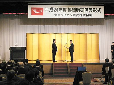 【大阪】大阪ダイハツ(三宮清士社長)は22日、大阪市都島区の太閤園で「2012年度優績販売店表彰式」を開催した。最上位の北伊丹ダイハツ販売をはじめ、年間実績12台以上の174社を表彰した。 三宮社長は「競合が激化する中で、ダイハツは大阪で...