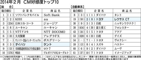 CM総合研究所(関根建男代表)がまとめた2014年2月のCM好感度ランキングは、ソフトバンクモバイルが前月に続き総合1位。自動車関連ではダイハツ工業の「タント」が2カ月連続の1位で、総合でも8位にランクインした。2位はトヨタ自動車の「レク...