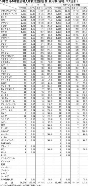 【14年2月の車名別輸入車新規登録台数(乗用車、貨物、バス合計)】