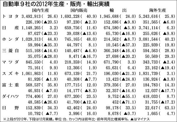 乗用車メーカー8社が28日に発表した2012年の生産・販売・輸出実績によると、国内での「エコカー補助金」による販売押し上げ効果に加え、前年の震災影響からの立ち直りなどにより、三菱自動車を除く7社で国内生産が前年実績に比べて増加した。また、...