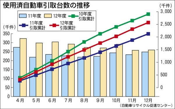 自動車リサイクル促進センター(JARC、郡嶌孝理事長)がまとめた2012年(1~12月)の使用済み自動車引取台数は、前年比18・7%増の340万8246台と、2年ぶりにプラスに転じた。東日本大震災で被災した車両の処理が進んだことや、買い替...