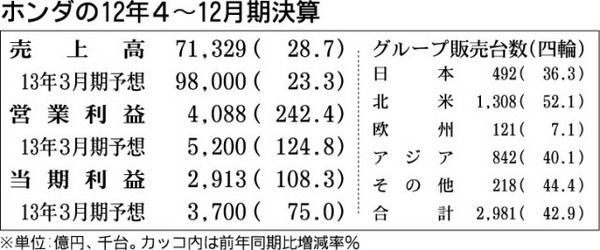 ホンダが31日に発表した2012年4~12月期の連結決算(米国会計基準)は、売上高が前年比28・7%増の7兆1329億円、営業利益が同242・4%増(3・4倍強)の4088億円となり、第3四半期までの累計(9カ月間)では2期ぶりの増収増益...