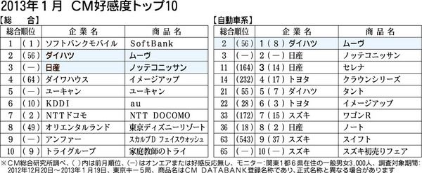 CM総合研究所(関根建男代表)がまとめた1月のCM好感度ランキングは、14カ月連続首位のソフトバンクモバイルに次いで、ダイハツ工業「ムーヴ」が2位、日産自動車の初売りキャンペーンが3位となった。企業別CM好感度でも日産が総合1位となったの...