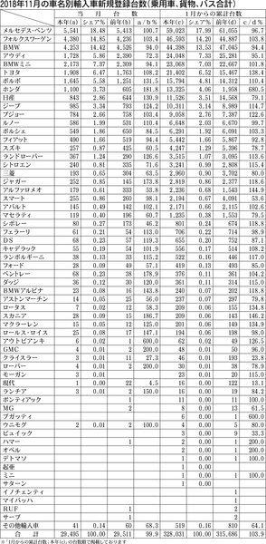 2018年11月の車名別輸入車登録台数は、首位のメルセデス・ベンツと2位のフォルクスワーゲンがともに2カ月連続で前年実績を上回った。前月がプラスだったBMWは前年同月を下回った。トップ3以外では、ボルボの販売が好調。11月の登録台数は同3...