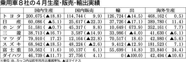乗用車メーカー8社、4月の生産・販売・輸出実績 国内生産 6社マイナス