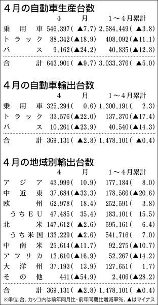 日本自動車工業会(自工会)が31日に発表した2016年4月の自動車国内生産実績で、四輪車は前年同月比9・7%減の64万3901台と2カ月ぶりに前年を下回った。熊本地震による工場被災や部品供給遅れの影響で、トヨタ自動車やダイハツ工業などが生...