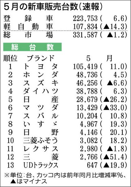 軽自動車の燃費不正問題に揺れた5月の新車販売(登録車、軽自動車合計)は、前年同月比1・2%減の33万1587台となり、2カ月ぶりにマイナスとなった。軽自動車が同14・3%減の10万7834台となり、17カ月連続のマイナス。市場全体が低調な...