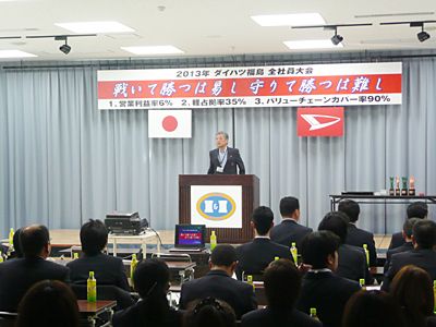 【郡山】ダイハツ福島(塚原靖弘社長)はこのほど、「2013年全社員大会」をI&Iビルで開催した。営業利益率6%、軽自動車の管内占拠率35%、バリューチェーンカバー率90%の実現を掲げ、「軽市場は益々競争が激しくなる。スローガン“戦いて勝つ...