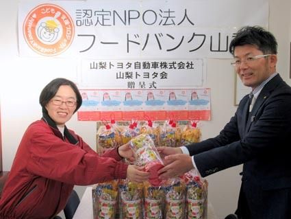 【甲府】山梨トヨタ(佐々木宏明社長)の社員で構成する山梨トヨタ会(保坂英治理事長)は17日、山梨県内の子どものいる困窮世帯に食料支援活動を行っているフードバンク山梨(南アルプス市、米山恵子理事長)を訪問、菓子の入ったクリスマスブーツ400...