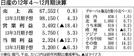 日産自動車が8日発表した2012年4~12月期の連結業績は、第3四半期(10~12月)の販売台数が北米を除いて全地域で減少したことなどにより収益が減少、9カ月累計では売上高が前期比0・8%増とわずかな増加にとどまり、営業利益は同18・4%...