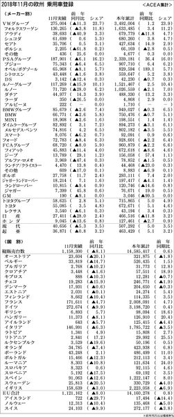 2018年11月の欧州乗用車販売は、EU合計で前年同月比8・0%減の112万1162台にとどまった。ドイツ、フランス、英国、イタリア、スペインの主要5カ国が揃ってマイナスになるなど、販売が振るわなかった。 メーカーグループ別の実績は、ダイ...