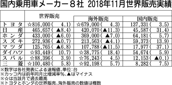 乗用車メーカー8社は26日、2018年11月の世界販売実績(速報値)を発表した。トヨタ自動車、ダイハツ工業、スバル、三菱自動車の4社が11月として過去最高だった。好調な海外販売がけん引した。三菱自は18年1~11月累計で17年(1~12月...