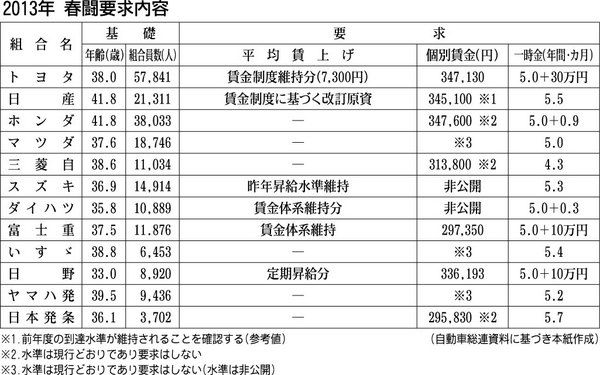 2013年の自動車春闘がスタートした。自動車メーカー各社の労働組合は13日、一斉に要求書を会社側に提出。集中回答日の3月13日までに、労使間で賃金や一時金を巡る交渉が続く。今年は全社が賃金改善を見送り、賃金制度維持分の確保を優先する。一時...