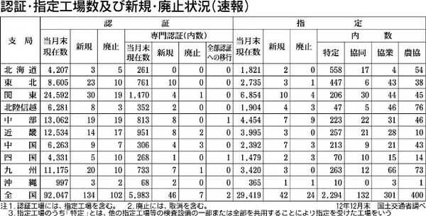 国土交通省は2012年12月末時点の認証・指定工場数及び新規・廃止状況(速報)をまとめた。認証工場数は前月比32工場増の9万2047件、指定工場は同19工場増の2万9419件で認証工場は7カ月連続、指定工場は6カ月連続で増加した。専門認証...