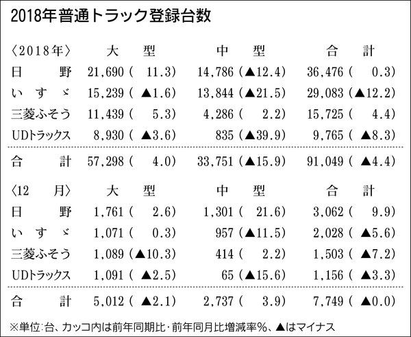 業界筋がまとめた2018年の普通トラック(積載量4トン以上)販売台数は、前年比4・4%減の9万1049台で9年ぶりに前年実績を下回った。中型トラックが前年に対し15・9%減と大幅に減少した。「17年9月に施行された排出ガス規制の反動減が1...