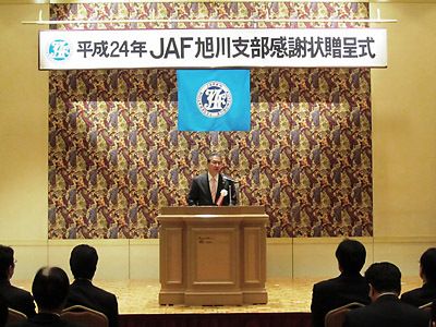 【旭川】日本自動車連盟(JAF)旭川支部(石原一智支部長)は、JAF50周年記念「感謝の会」を開催。昨年の入会促進で好成績だった企業20社、個人25人を表彰した。 はじめに石原支部長は、1月末同支部在籍会員数(7万4818人、前年同月比4...