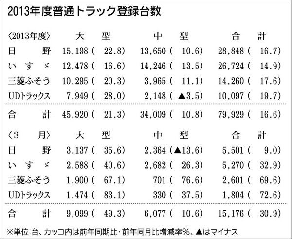 業界筋がまとめた2013年度の普通トラック(積載量4トン以上)販売は、前年度比16・6%増の7万9929台だった。前年実績を上回るのは4年連続。大型、中型ともに2桁増を記録し、7万台超えは07年度以来6年ぶりとなった。東日本大震災に伴う復...