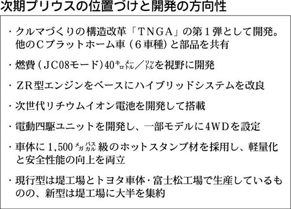 トヨタ自動車が開発中の次期「プリウス」は、2015年春から夏にかけての市場投入となりそうだ。現状、次期型の生産開始時期は15年4月に設定している。堤工場(愛知県豊田市)とトヨタ車体・富士松工場(同刈谷市)で手がけている生産の大半を堤工場に...