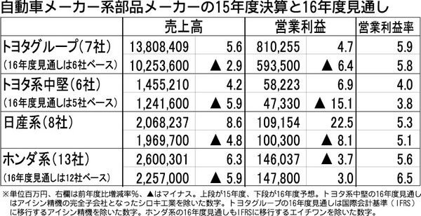 国内自動車メーカーの系列部品メーカーの2015年度(16年3月期)連結決算はトヨタ系大手・中堅、日産系、ホンダ系のすべてが増収となった。営業利益もホンダ系を除いて増益となり、14年度と比べて円安で推移したことによる為替差益が各系列の業績を...