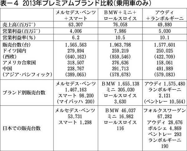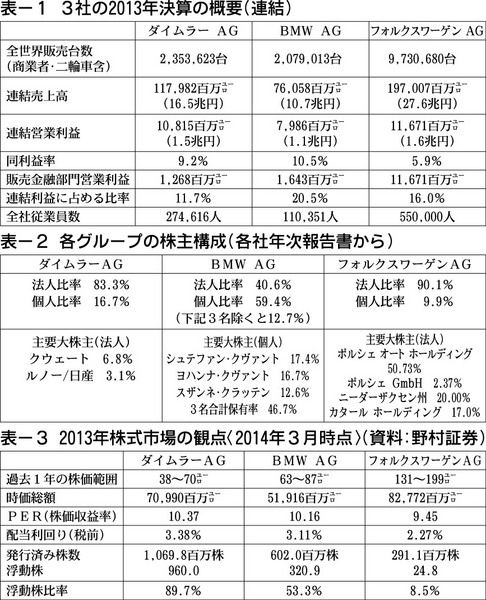 ドイツ・プレミアム・ブランドの3社(ダイムラーAG、BMW・AG、フォルクスワーゲンAG)の2013年連結業績が先ごろ発表された。各社の年次報告書をもとに財務内容と今後の戦略について分析をしてみる。 3社とも10兆円以上の規模の売り上げで...