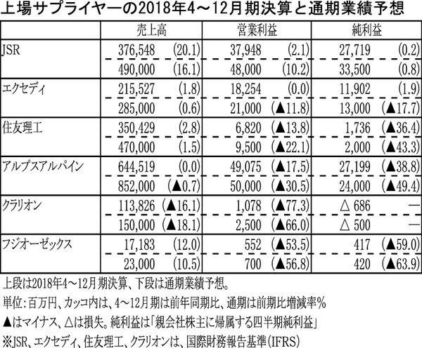 【上場サプライヤーの2018年4~12月期決算と通期業績予想】