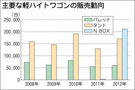 軽ハイトワゴン(車高170センチ以上の2ボックス乗用車)の販売競争は、ホンダが「N BOX(エヌボックス)」を新規投入したことにより激化している。2012年の販売台数は、ダイハツ工業「タント」が17万609台、スズキ「パレット」が6万13...
