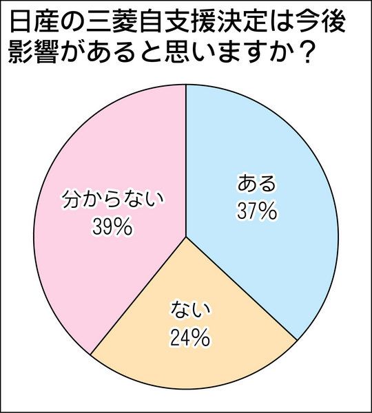 東京商工リサーチ名古屋支社情報部は17日、三菱自動車の協力会社に実施した緊急アンケート調査の結果を発表した。日産自動車の三菱自支援の決定が今後に与える影響について、37%が「ある」、24%が「ない」、39%が「分からない」と回答。支援決定...
