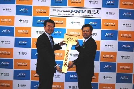トヨタ久保グループの2社(トヨタカローラ南海、ネッツトヨタ南海=堺市西区)は20日、大阪府和泉市に家庭用電源で充電できる「プリウスPHV(プラグインハイブリッド)」1台を公用車として寄贈した。両社の久保尚平社長(46)が辻宏康市長(53)...