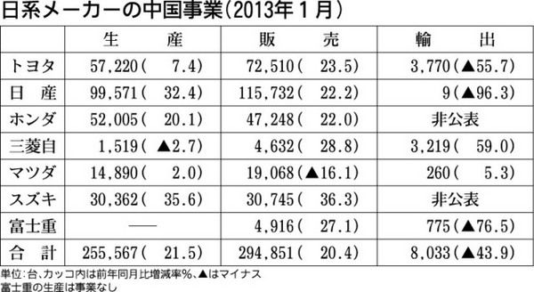 日本メーカー7社による中国での事業実績(2013年1月分)がまとまった。7社合計の販売台数は前年同月比20・4%増の29万4851台となり、12年9月に尖閣諸島問題が発生してから初めて増加に転じた。生産台数合計も同21・5%増の25万55...