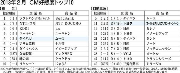 CM総合研究所(関根建男代表)がまとめた2月のCM好感度ランキングは、15カ月連続首位のソフトバンクモバイルを始め、携帯電話会社が上位を独占した。自動車関連企業ではダイハツ工業「ムーヴ」の5位が最高位となった。 この調査は、東京キー5局で...