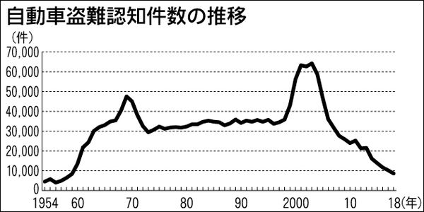 警察庁は7日、2018年の自動車盗難認知件数(暫定値)が前年比15・5%減の8628件だったと発表した。統計の公表があった1954年以降で1万件を下回るのは、1959年(8407件)以来、59年ぶりとなる。ピークとなった2003年(6万4...