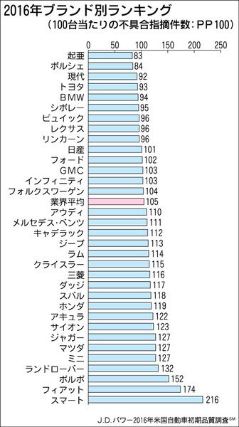 JDパワーが22日発表した「2016年米国自動車初期品質調査」(IQS)のブランド別ランキングによると、全33ブランド中、韓国の起亜が第1位となり、27年ぶりに非プレミアム系ブランドが首位になった。起亜は昨年の調査ではポルシェに次ぐ2位だ...