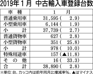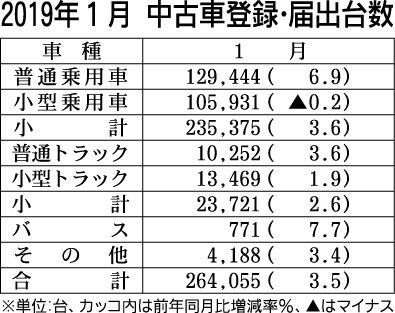 ◆1月中古車登録2ヵ月ぶり増加 日本自動車販売協会連合会(自販連)が13日発表した1月の中古車登録台数は、前年同月比3・5%増の26万4055台と2カ月ぶりのプラスとなった。 車種別では、小型乗用車を除いて前年同月プラスだった。乗用車全体...
