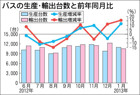 日本製バスの輸出が増えている。日本自動車工業会(自工会)のまとめによると、1月のバス輸出台数は前年同月比15・7%増の1万518台。5カ月連続で1万台を超えるとともに、1月としては過去42年で2番目に多い台数となった。自工会では「新興国で...