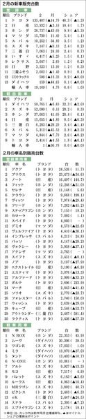 日本自動車販売協会連合会(自販連)と全国軽自動車協会連合会(全軽自協)は6日、2013年2月の乗用車車名別販売台数順位を発表した。1位はトヨタ「アクア」で台数は2万4526台。2位は「プリウス(シリーズを含む)」で前月の3位から浮上、ホン...