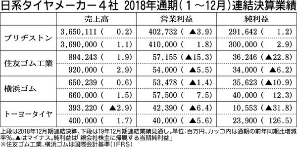 国内タイヤメーカー4社の2018年12月期連結決算が発表された。3社が増収減益、1社が減収減益だった。ブリヂストンと住友ゴム工業は新車用タイヤが国内外で好調に推移した。一方で市販用タイヤは、米中貿易摩擦による中国経済減速に起因する販売減や...