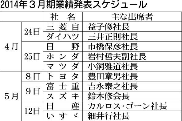 上場する自動車メーカーの2014年3月期連結業績発表が24日にスタートする。今決算では10社中8社が過去最高の営業利益となる見通しなのを始め、各社とも好決算が予想される。アベノミクス効果による円高修正が各社の業績押し上げに寄与したのに加え...