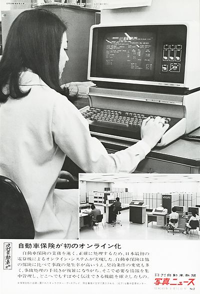 SNS、スマホ、タブレットとICT(情報通信技術)の進歩は今日でも目を見張るものがあるが、写真は「日本初の電算機による保険オンラインシステム」と言う触れ込みの記事。自動車保険は、他の保険に比べて事故の発生率が高いほか、契約条件の変更頻度も...