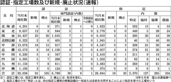 国土交通省は2016年5月末時点の認証・指定工場数および新規・廃止状況をまとめた。認証工場数は前月比14工場減の9万2034工場で3カ月連続で減少。指定工場数は同2工場減の2万9844工場だった。専門認証工場数は6799工場で前月比21件...