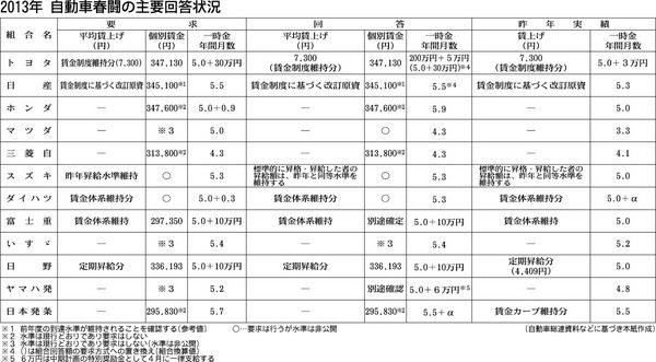 賃金・一時金に関する2013年春の労使交渉(春闘)は13日、自動車メーカー各社の集中回答日を迎えた。今春闘では自動車メーカー系労組が賃金改善(賃上げ)要求を見送る中、一時金の確保が焦点となった。自動車総連(相原康伸会長)の拡大戦術会議に登...