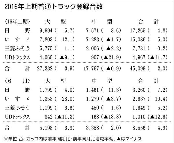 業界筋がまとめた1~6月の普通トラック(積載量4トン以上)販売は、前年同期比2・0%増の4万5099台で、3年連続で増加した。内訳を見ると大型トラックは3・9%増の2万7332台、中型トラックは0・9%減の1万7767台となった。1~4月...