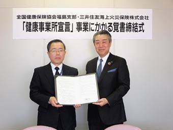 【福島】三井住友海上火災保険福島支店(小嶋俊彦支店長)は5日、全国健康保険協会福島支部(協会けんぽ、齋藤博典支部長)と「健康事業所宣言」事業にかかる覚書を締結した。 従業員の健康維持が企業の生産性につながる「健康経営」が注目されている。三...