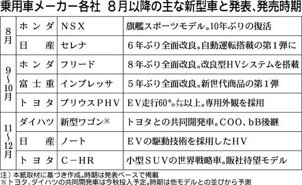 国内メーカー各社が8月以降、新車投入を活発化する。8月はホンダがフラッグシップスポーツ「NSX」、日産自動車が自動運転技術「パイロットドライブ1・0」を採用した第1弾「セレナ」を発表する。これ以降は12月のトヨタ自動車の小型SUV「C―H...