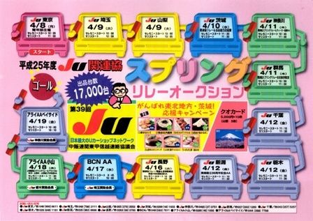 【新潟】中販連関東甲信越連絡協議会(JU関連協、海津博会長)は、4月8日から19日までの期間、JU提携3会場を含む計13会場で「2013年度オールJU関連協スプリングリレーAA(中古車オークション)」を開催する。全会場のトータル出品目標は...
