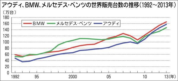 世界自動車市場でのプレミアムブランドのトップ3を占めるアウディ、BMW、メルセデス・ベンツは、それぞれ2020年までにナンバー1を目指しており、近年は接戦となっている。 世界プレミアム市場での販売は05年以来BMWがトップにある。14年1...
