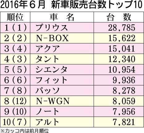 2016年上期(1~6月)の新車販売の車名別順位(軽自動車含む)は、トヨタ「プリウス」が3年ぶりに首位に返り咲いた。昨年12月に全面改良して以降、独走状態にあり、6カ月累計の実績で2位以下に5万台弱の差をつけた。2位は2年連続でホンダ「N...