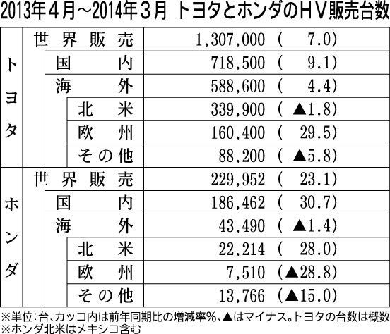 トヨタ自動車とホンダの2013年度のハイブリッド車(HV)世界販売台数がまとまった。日刊自動車新聞社の調べによると、トヨタ自動車は前年度比7・0%増の130万7千台に拡大、ホンダは同23・1%増の22万9952台と大幅なプラスに転じた。ト...