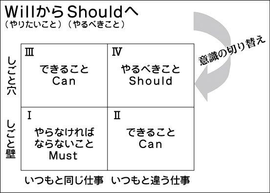 さらに、私たちがよく引き合いに出す「やらなければならないこと」(Must)、「できること」(Can)、「やりたいこと」(Will)と「仕事の窓」とは、どんな関係にあるのでしょうか。図は、その連関を示したものです。 ・I象限⇔「やらなければ...